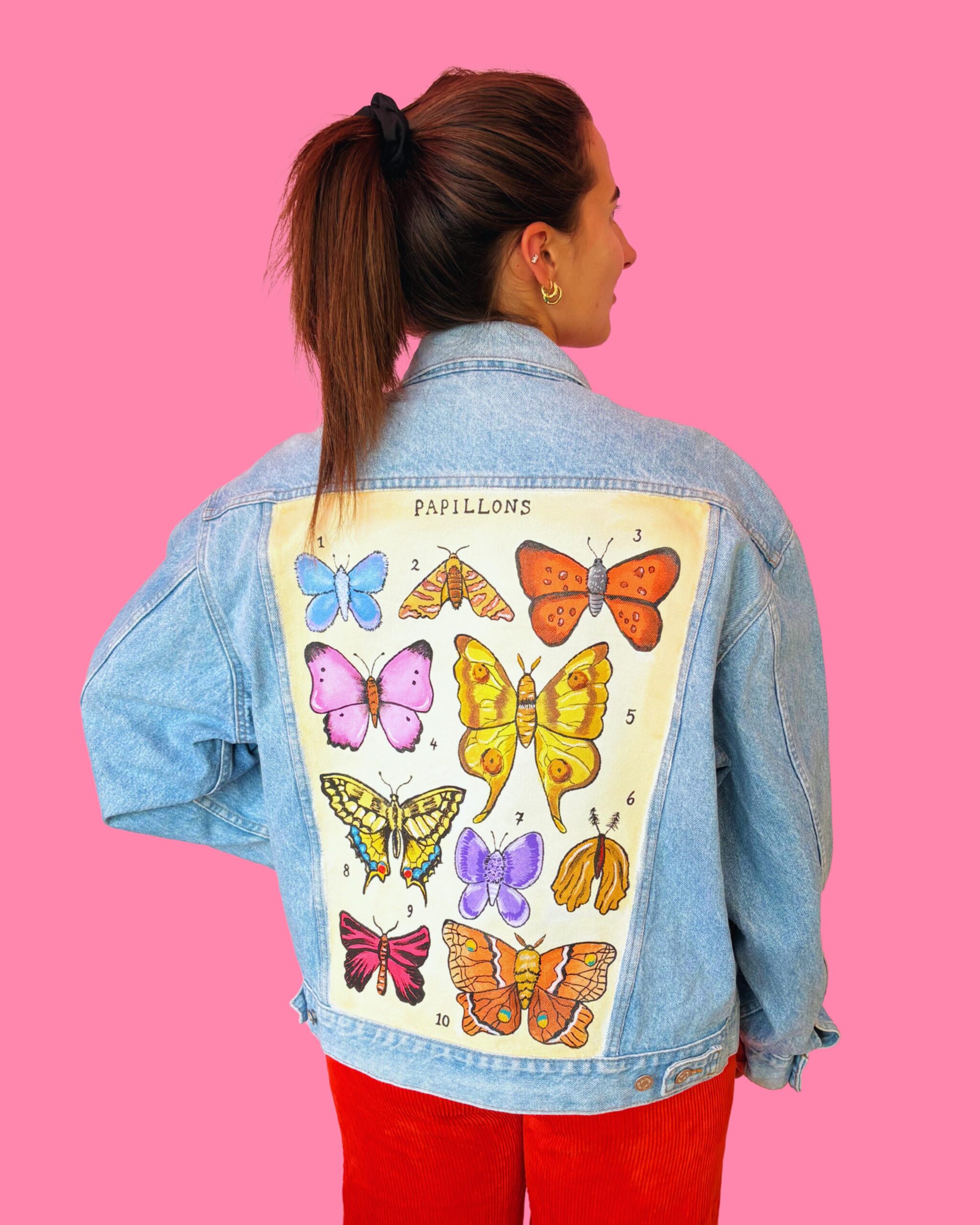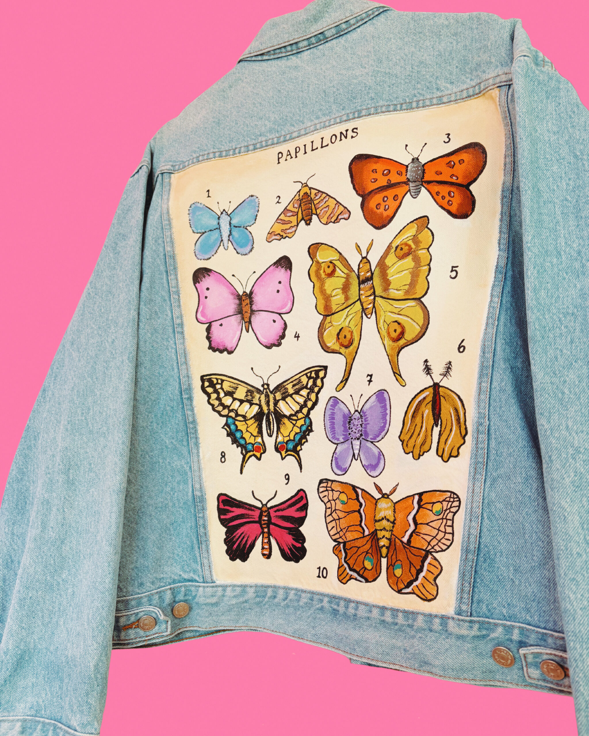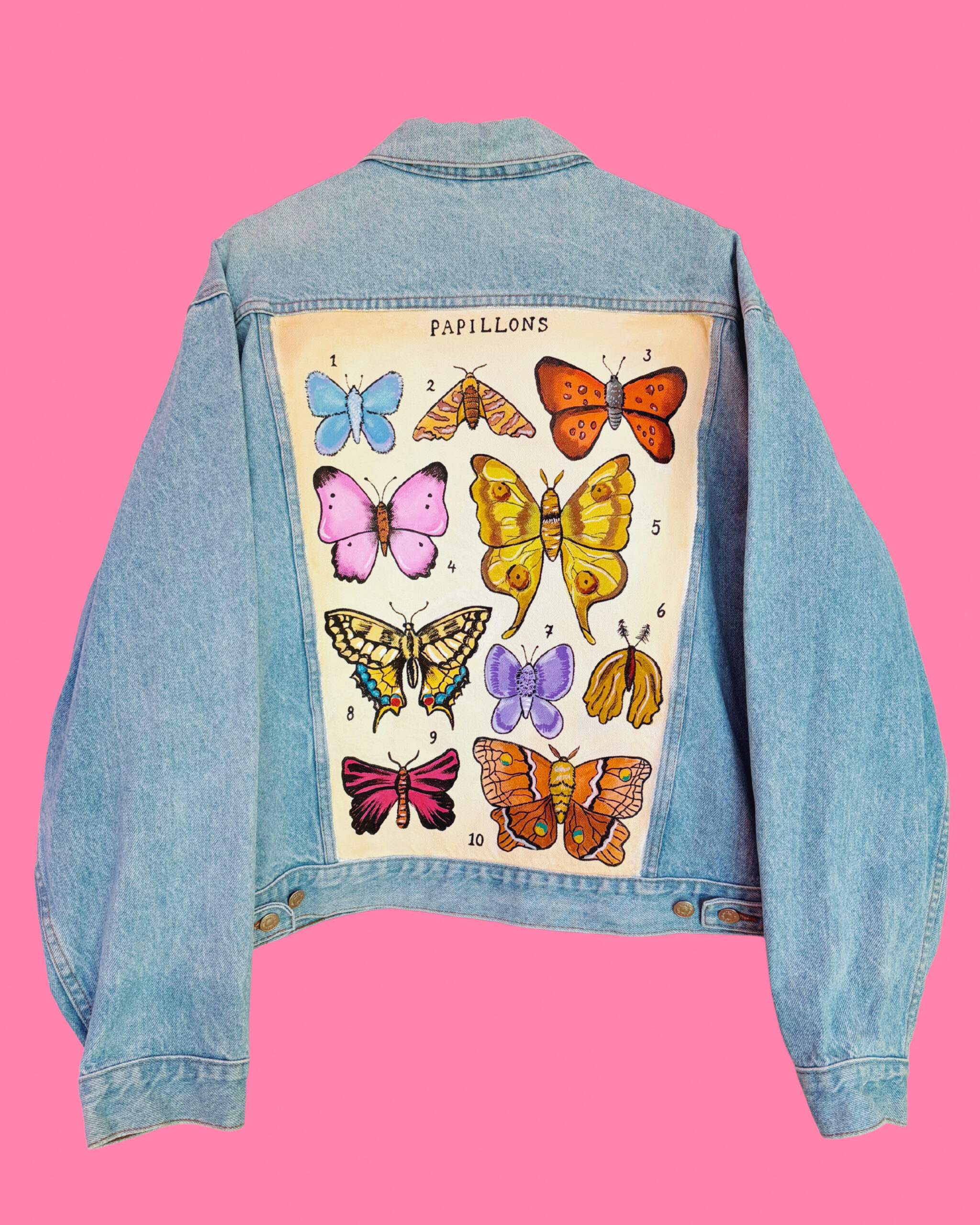 This one-of-a-kind jacket is made from 100% cotton denim. Each hand-painted design is sealed for durability, but treat it like art.