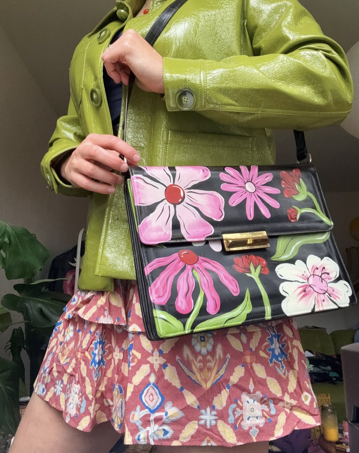For the stylish, independent rebel who knows that fashion should be both bold and conscious. This one-of-a-kind vintage leather bag, hand-painted with a touch of edge and romance, is perfect for carrying your essentials while making a fashion statement.